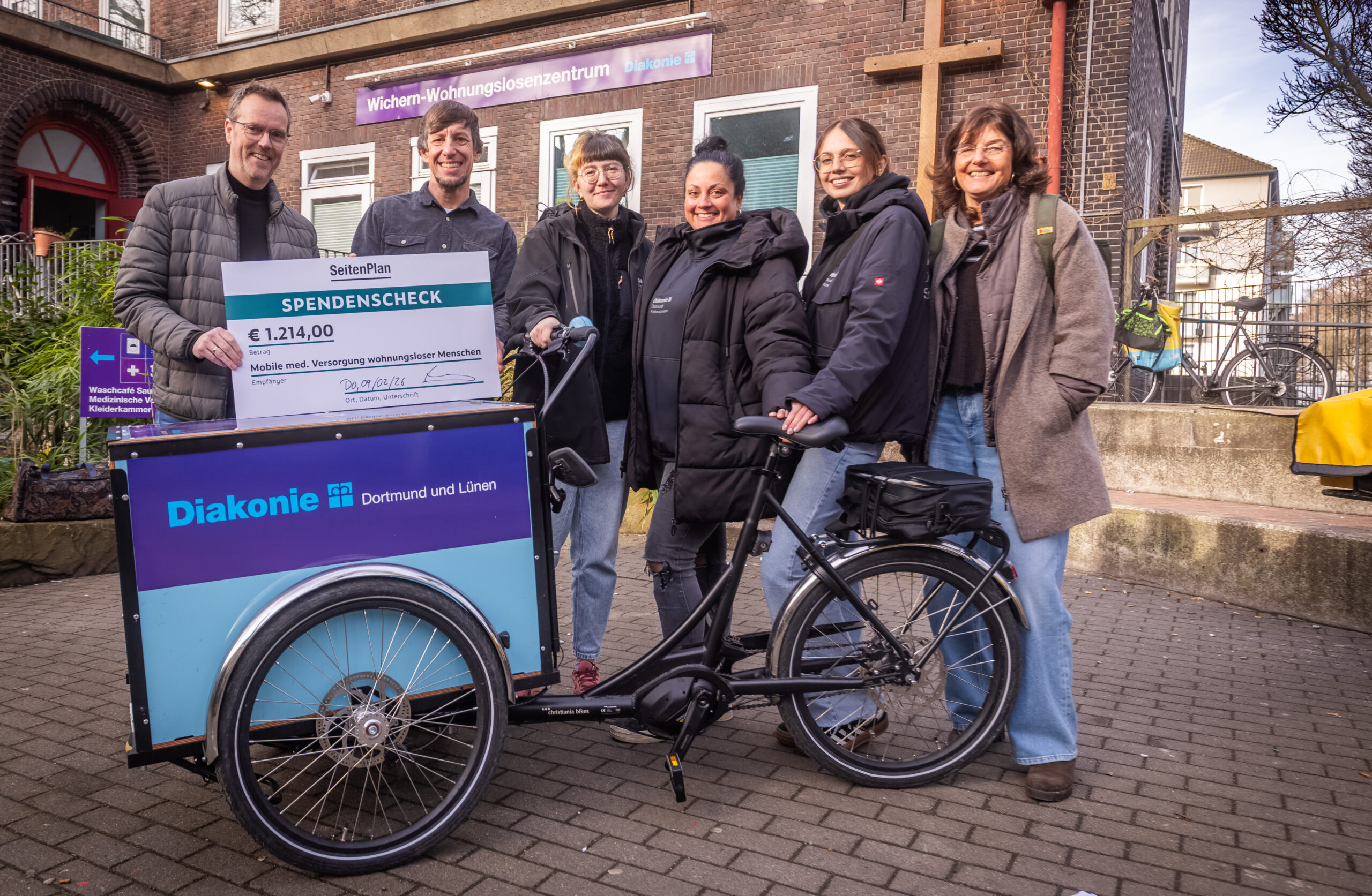 Dank einer kreativen Weihnachtsaktion der Agentur SeitenPlan kamen 1.214 € für das Projekt „Aufsuchende medizinische Hilfen“ zusammen. Timo Stascheit, Leiter des Wichern-Wohnungslosenzentrums, und sein Team nahmen die Spende entgegen und freuten sich über die Unterstützung. Das Projekt leistet mit rund 2000 Behandlungen im Jahr medizinische Hilfe für wohnungslose Menschen in Dortmund.